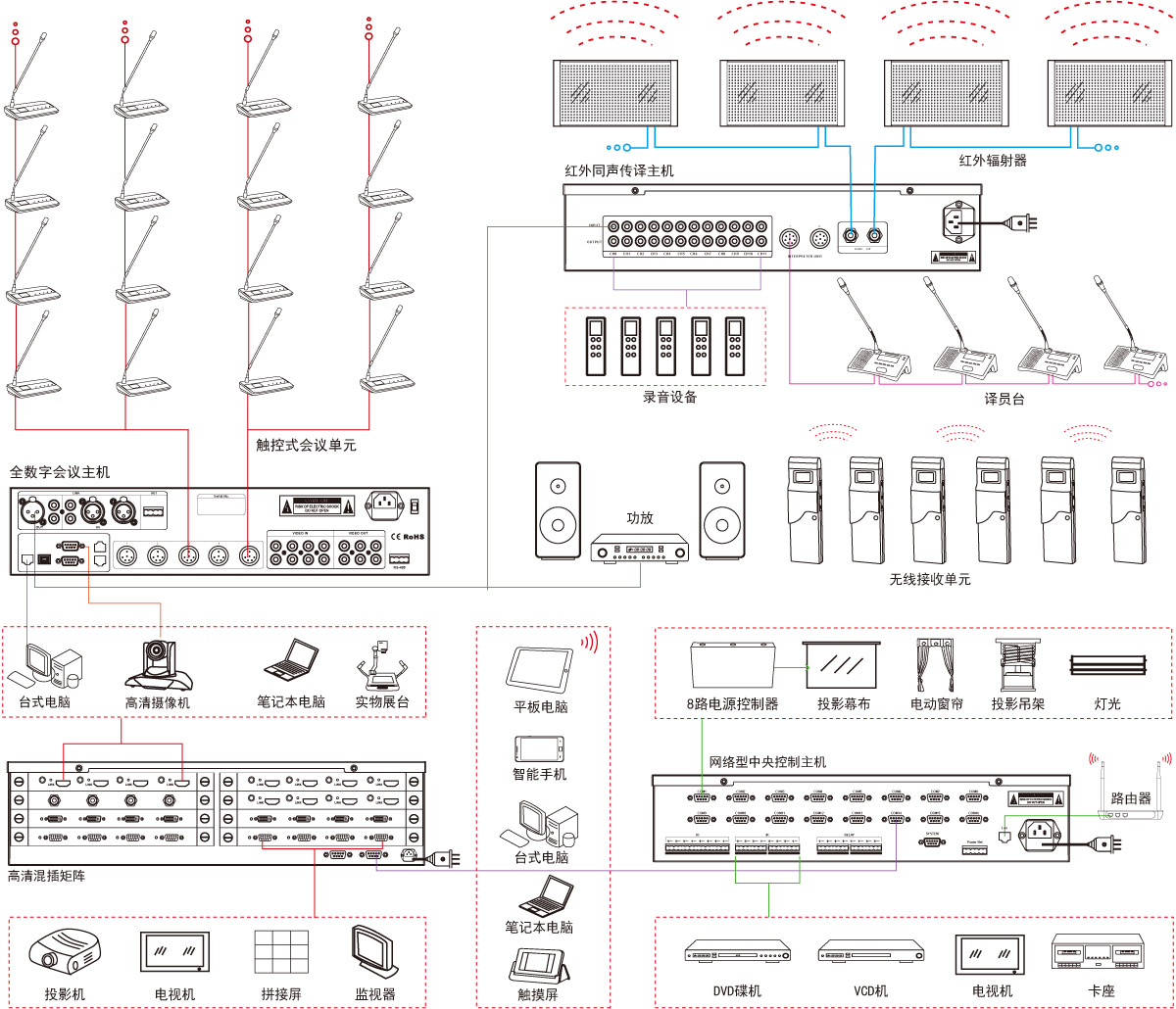 • 采用数字强抗干扰技术,确保会场内设备不受手机、蓝牙、无线电、WiFi等信号干扰;