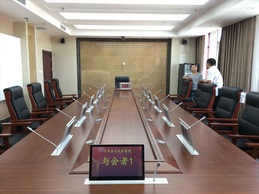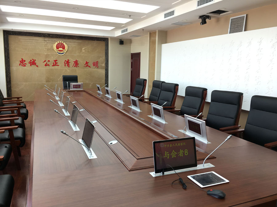 华韵无纸化会议终端前屏采用15.6英寸超薄触控屏,后屏采用10.1英寸高清显示屏,采用嵌入式升降设计,航空级别铝镁合金面板,经18道工序打磨而成;采用德国“IRIN”芯片,更加优化的电路设计,保证产品的可靠性;采用多点平衡升降系统及高精度导轨设计,保证升降平稳、匀速、流畅;采用数字智能同步定位识别处理技术,保证升降速度统一性;采用超静音电机,保证运行噪音低于30分贝;下降过程中具备自动校正话筒杆功能;支持线控、遥控、中控、分组控制功能。