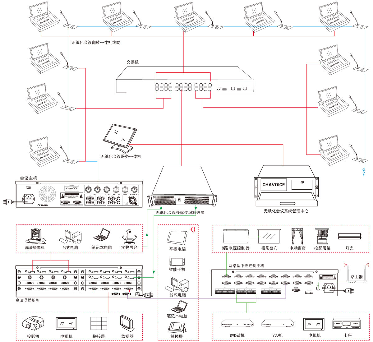 - 具备单主席、多主席功能,主席有控制会议进程与信号切换,发起表决、启动会议议题、结束会议等功能;